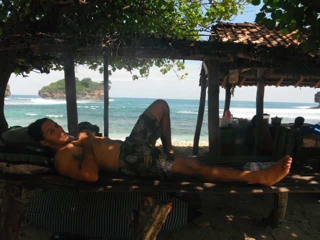 the warung when I get out of the water. I wave at him. He has his arms crossed