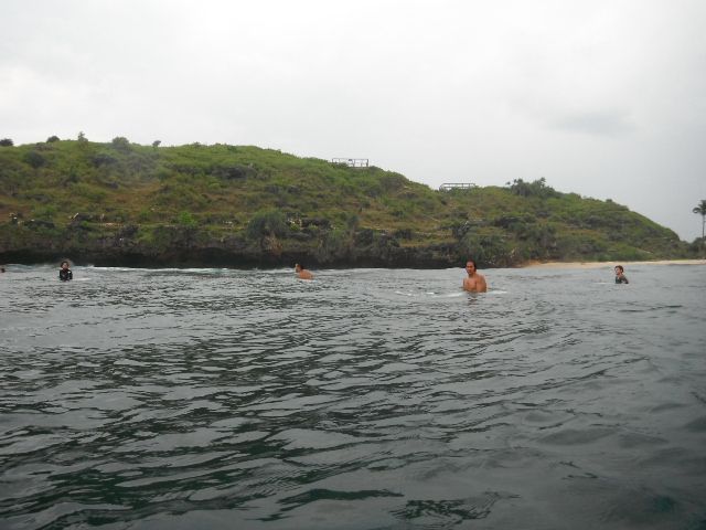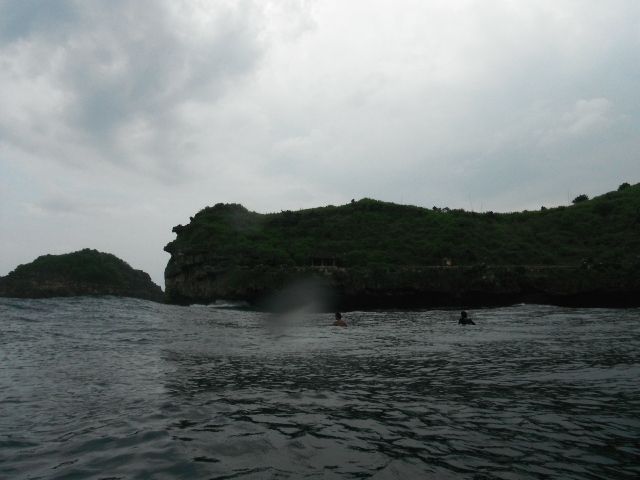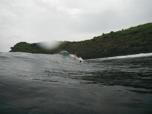 A half an hour later, we reach the spot. The three guys we saw this morning at Choco Point are here. The wind is offshore, but the water’s still a bit choppy. The tide is high, breaking next to a cliff, producing a right. A wedge pops up out of the ocean. It’s rideable, but the shape tapers off quickly as it peels. A couple walls roll through too. This is a reef break that has potential, but we can tell that the tide is a little too high. Maybe in an hour it might be good.