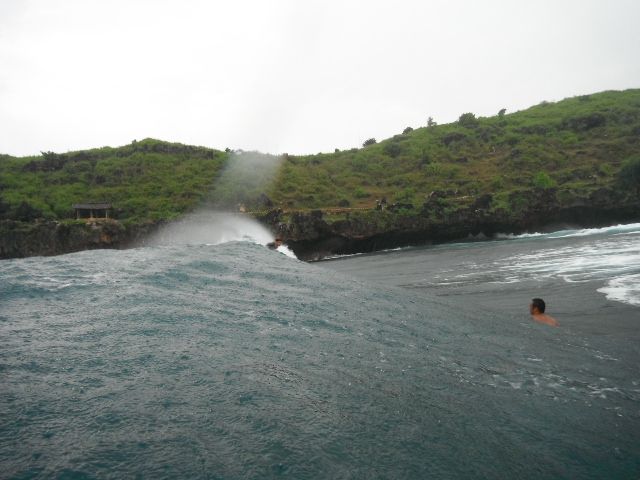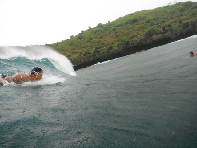 After a couple of waves, the Portuguese guy goes in. Ana and the white-Indo chick make it out. A new white dude who I haven’t seen before is out here, as well as this huge, buff, local Indo guy with dread locks. I have never seen him before. He’s on a fun board, something that will float his weight.