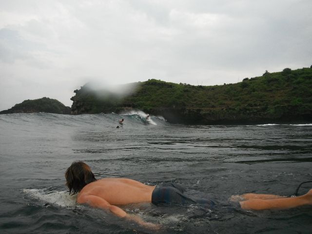 The three of us paddle out together. We’re expecting that the trio who are out there are going to be pissed. Instead, the British dude welcomes us, says that it’s not so bad on the sets. And just like that, with the tide going lower, we hit a window.