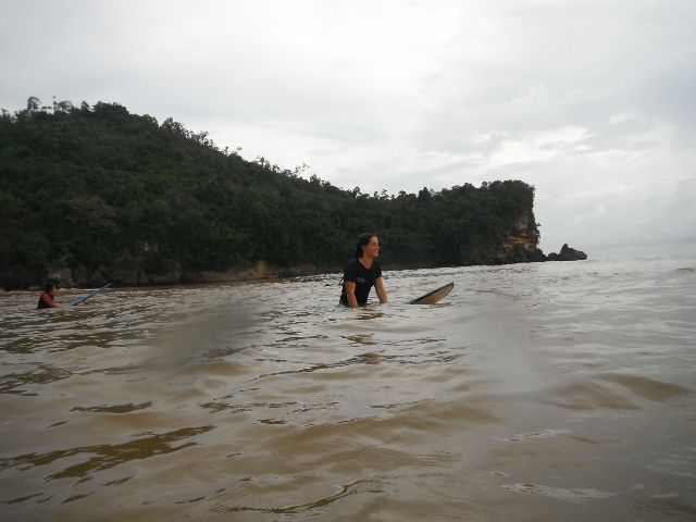 Near the deeper water, a new longboarding couple who are staying at Compound One catch a couple of waves. They work the three-foot lefts from top to bottom, even throwing out a little bit of water out the back. Looks fun enough. Ana is out there too. She catches a wave and goes straight, completely missing the shoulder.
