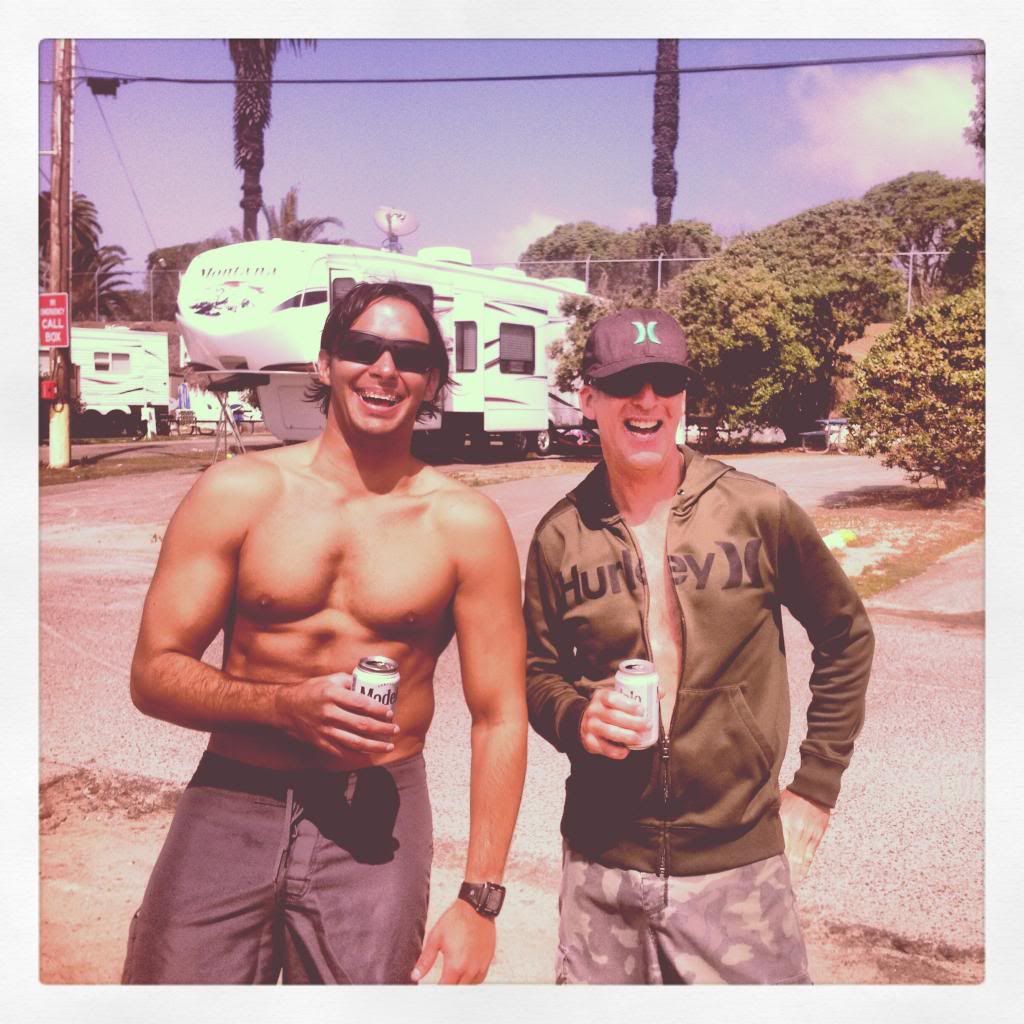 the part: board shorts, flip flops, and T-shirts. We catch up as much as we