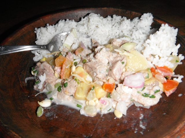 made for a feast, of tuna salad. Next to it is a basket of white rice. Under