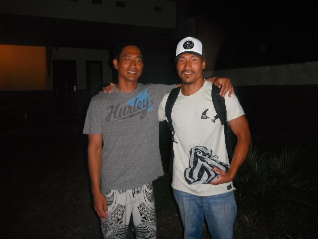 undoing the bungee cord around the surfboard. Someone’s walking out to Choco