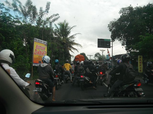 checks in Indo. Mopeds gamble passing us up despite the oncoming buses. At a