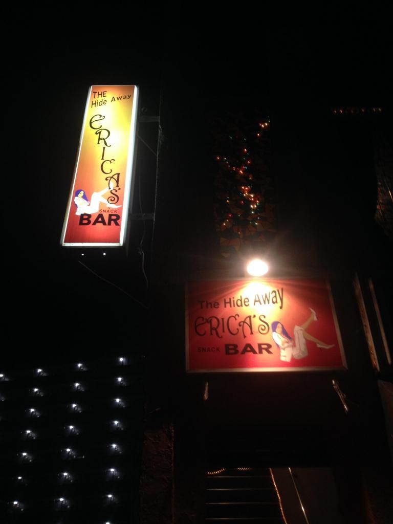 We were still heading back to base anyway. Some of the neon lights were on now. In a cut between buildings, we noticed that the upstairs lights were on, a bar sign in front of it.