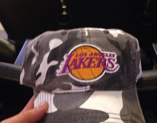 Lakers. First win! He has a hat, a free giveaway at the game, waiting in his