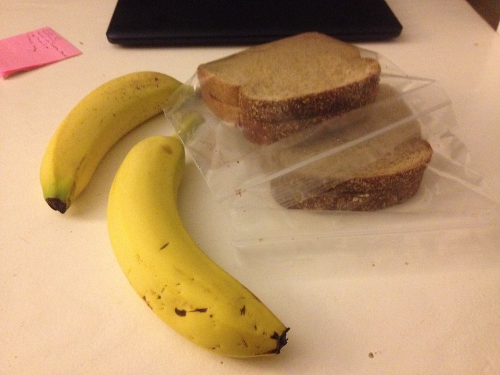 exactly two bananas, two PB&J sandwiches, and a thermos full of water, I